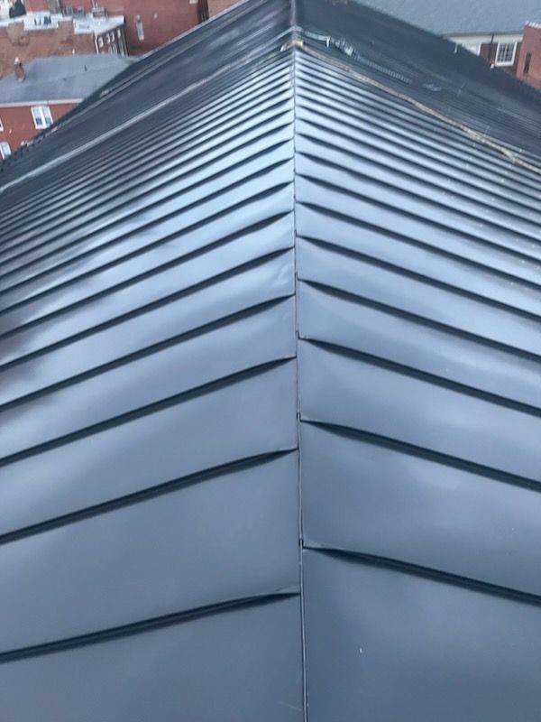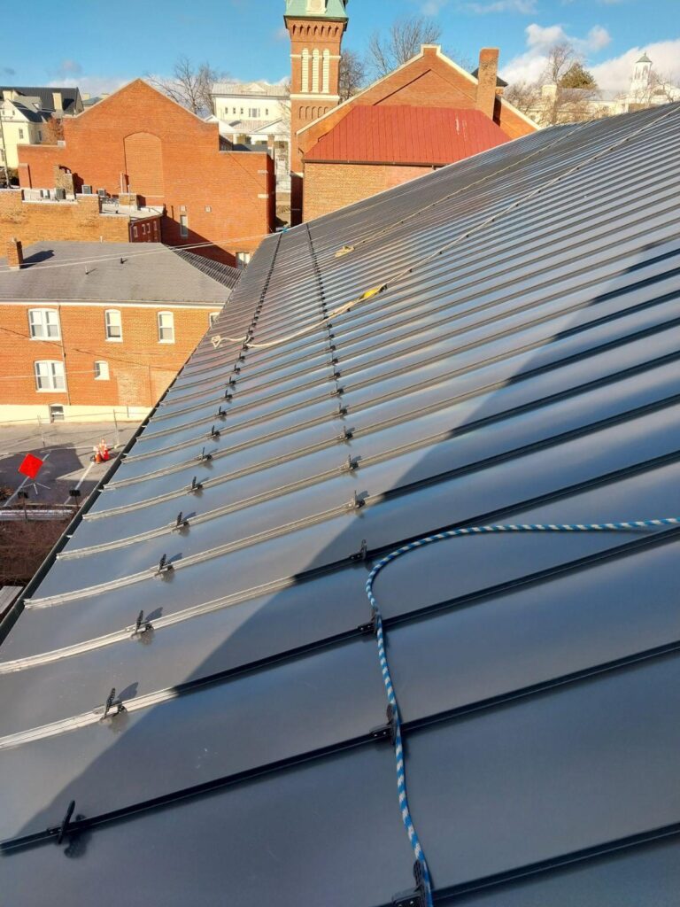 Due to limited space around the building, the project required innovative ladder-based access instead of traditional scaffolding, while maintaining strict adherence to all local, state, and federal safety requirements, including OSHA standards. The team coordinated closely with the City of Staunton to complete the project within a tight 60-day schedule, ensuring minimal disruption to ongoing courthouse operations. Each aspect of the installation was executed with precision, including a hand-crimped, double-lock ridge seam sealed in the field—no ridge cap permitted per design specification—to achieve a watertight and historically accurate finish.