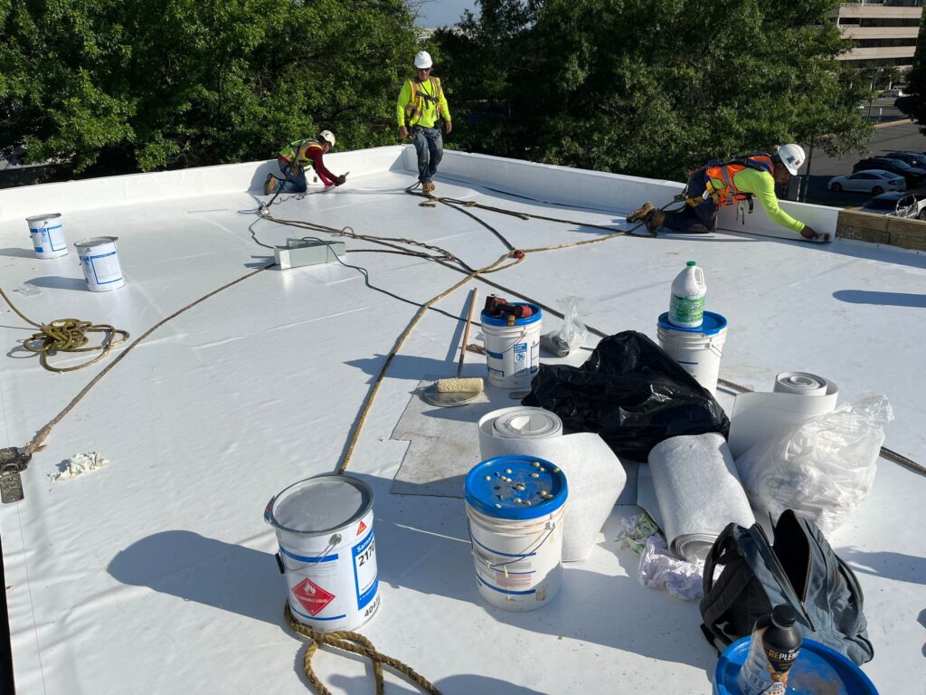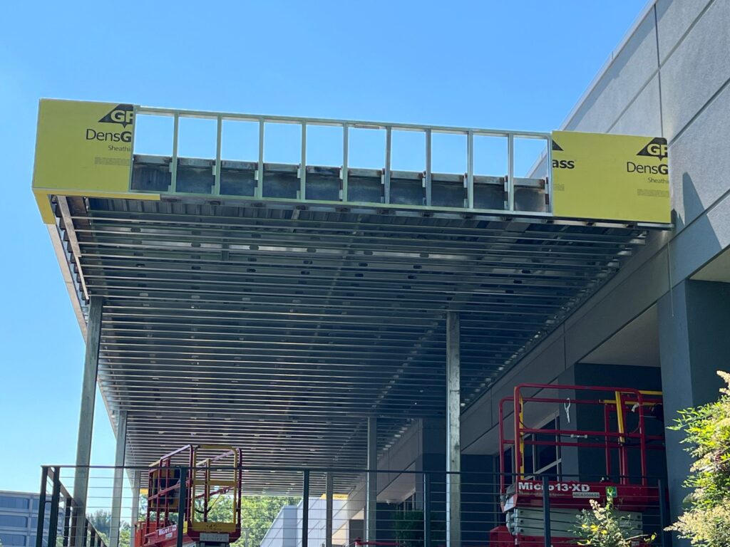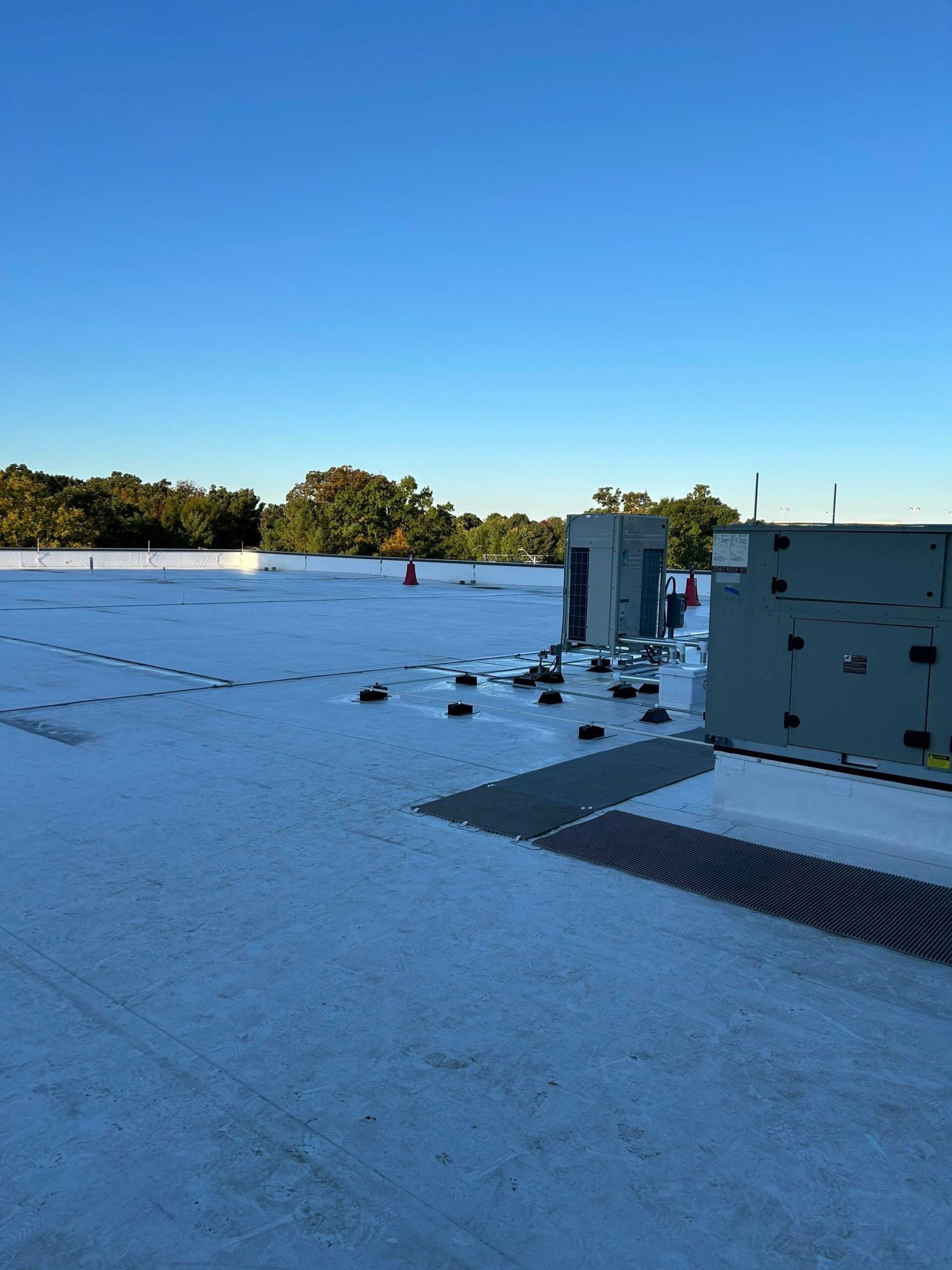 The scope of work included debris removed to DPR-provided dumpsters, followed by extensive demolition of the existing roofing systems. This demolition encompassed the removal of roofing assemblies, rooftop aggregate, flashings, terminations, copings, roof hatches, skylights, smoke dampers, roof drains, internal downspouts, associated piping, and specified sections of steel decking with daily clean up.. NECC then furnished and installed a new roofing system, which included a PVC membrane, insulation, vapor retarder, substrate and cover boards, concrete cover board, tapered insulation, roof expansion joints, crickets, traffic pads, and safety tiebacks. Additional scope included the installation of new scuppers, downspouts, roof drains, overflows, flashing, coping, parapet sheathing, canopy roofing components, and pipe boot assemblies with spray foam insulation and stainless-steel clamps. New metal decking was provided and installed where existing decking was removed or deemed unusable, and all roofing components were completed to meet specified R-value requirements and performance standards, with provisions included for EFVM testing.